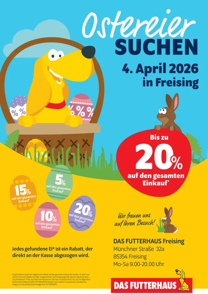 Am 4. April 2026 wird es bunt, spannend und besonders lohnenswert im DAS FUTTERHAUS in Freising: Bei unserer großen Ostereiersuche wartet nicht nur Spaß, sondern auch ein echter Vorteil für Ihren Einkauf!