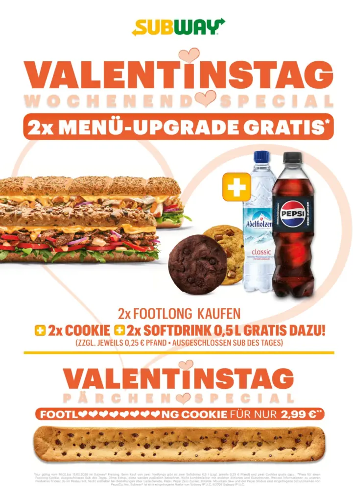 Zum Valentinstag wird’s lecker: Beim Kauf von 2 Footlongs gibt es 2 Cookies und 2 Softdrinks (0,5 l) gratis dazu!*